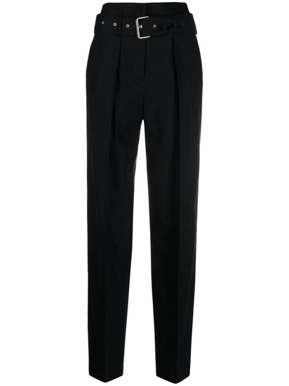 belted tailored trousers from IRO featuring black, wool blend, stretch-design, pleat detailing, pressed crease, high waist, belted waist, buckle fastening, two side slit pockets, two rear button-fastening jetted pockets, tailored cut and straight hem. Benet high-waisted trousers Size and Fit - This piece fits true to size. We recommend you get your regular size. Model is 1,75m / 5ft 8in wearing size 36 (FR)