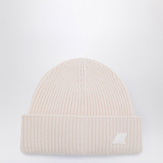K-Way hat in a blend of wool and cotton in gardenia mélange white, characterized by ribbed design and a cuff with a silicone logo patch on the front.
