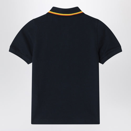 K-Way polo in blue piqué cotton, characterized by buttons on the front, logo patch on the chest, short sleeves, and collar with contrasting striped edges.