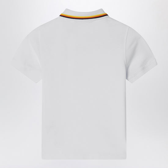 K-Way polo in white piqué cotton, characterized by buttons on the front, logo patch on the chest, short sleeves, and a collar with contrasting striped edges.