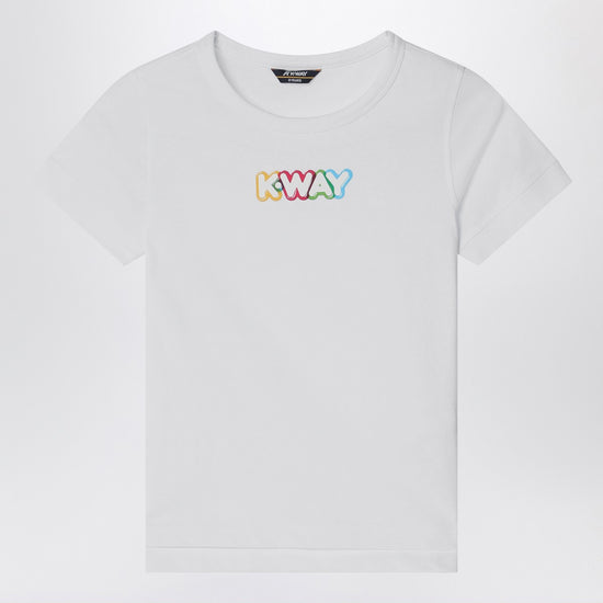 K-Way round-neck T-shirt in white cotton jersey, characterized by short sleeves, side slits, and contrasting logo lettering on the chest.