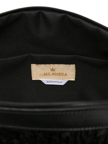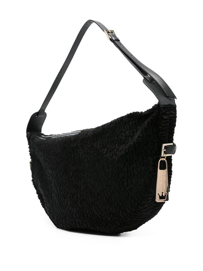 black textured effect buckle fastening adjustable strap curved shape gold-tone logo tag Nicoletta shoulder bag Size and Fit - DEPTH: 10.0 Centimetres. HEIGHT: 28.0 Centimetres. WIDTH: 52.0 Centimetres.