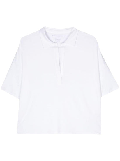 white jersey texture stretch-design polo collar short sleeves straight hem Oversized viscose polo shirt Size and Fit - This piece fits true to size. We recommend you get your regular size. Model is 1,75m / 5ft 8in wearing size 1 (NUM)