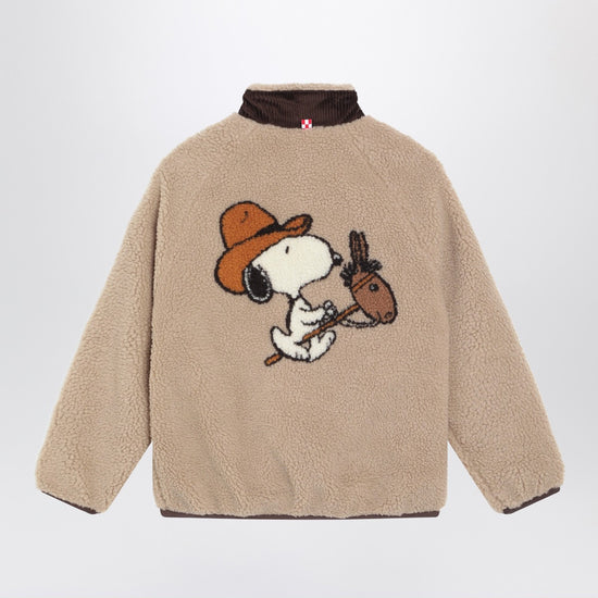 Beige sherpa jacket by MC2 Saint Barth, featuring front zip closure, long sleeves, high collar, one chest zip pocket with logo lettering, brown corduroy details, two side zip pockets, Snoopy motif on the back, and regular fit.