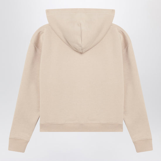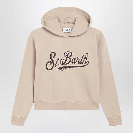 Hoodie by MC2 Saint Barth in beige cotton blend, featuring long sleeves, dropped shoulders, leopard-pattern embroidered logo lettering on the front, and ribbed trims.