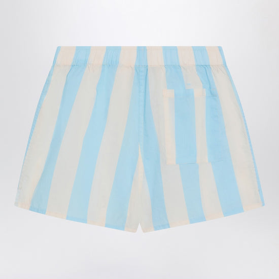 Short by MC2 Saint Barth in white and light blue striped cotton, featuring an elasticated waistband with logo patch on the front, two welt pockets, a patch pocket on the back and side vents.