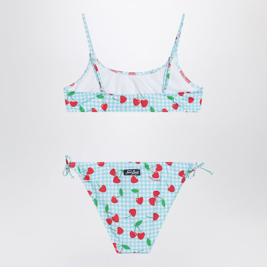 Two-piece bikini by MC2 Saint Barth in nylon with a light blue and white Vichy pattern, featuring cherries all over, panties with ties, bralette with adjustable straps, and a logo patch on the back.