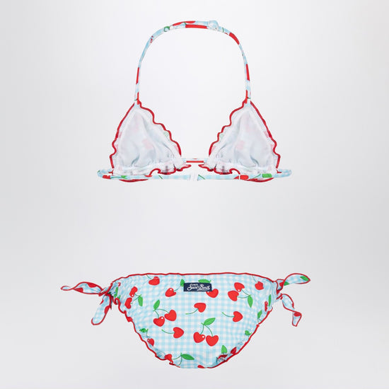 Two-piece bikini by MC2 Saint Barth in nylon with a light blue and white Vichy pattern, characterized by wavy red edges, all-over cherries, tie-side bottoms, adjustable bra, and back logo patch.