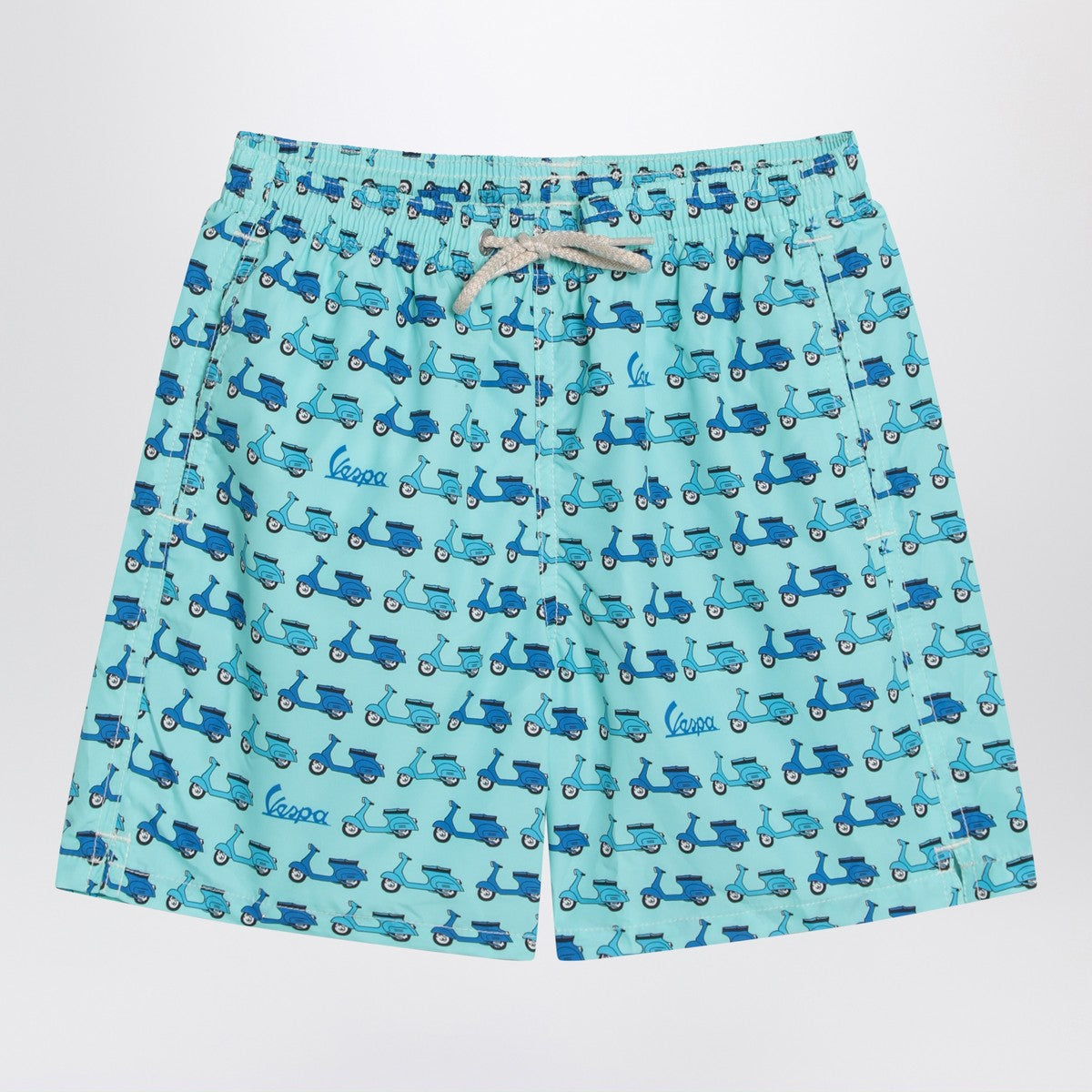 MC2 Saint Barth swimsuit in lightweight quick-drying fabric in light blue, featuring an all-over contrasting Vespa print, elasticized waist with drawstring, two side welt pockets, one back patch pocket with flap, rear eyelets, and a rear logo patch.