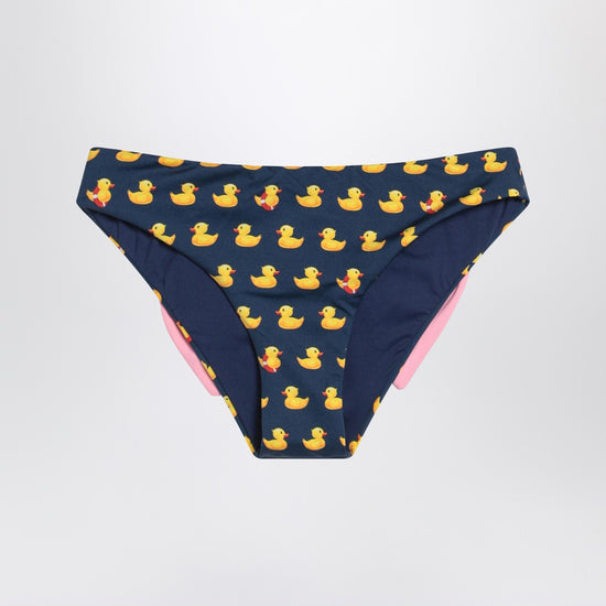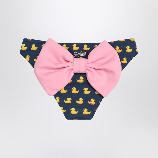 MC2 Saint Barth navy blue nylon slip, characterized by an all-over print with small contrasting ducks, mid-rise, large pink bow at the back, and rear logo patch.