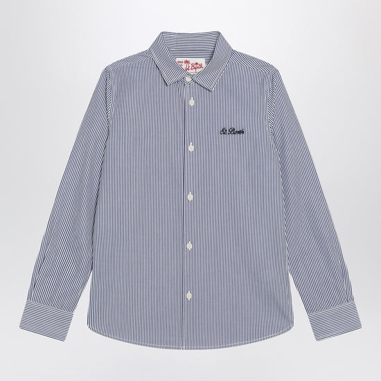 MC2 Saint Barth white cotton shirt with navy blue stripes, featuring a front button placket, long sleeves with buttoned cuffs, classic collar, embroidered lettering logo on chest, Snoopy print on back and regular fit.