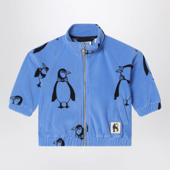 Blue recycled fabric sweatshirt from Mini Rodini featuring penguins, featuring a stand-up collar, a zip fastening, two welt pockets on the front with a logo patch and elasticated edging.