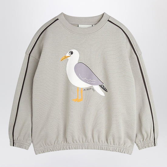 Mini Rodini sweatshirt in organic cotton grey, featuring long sleeves, ribbed crew neck, seagull print on the front, elasticized cuffs and hem, and a comfortable fit.