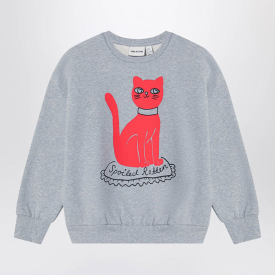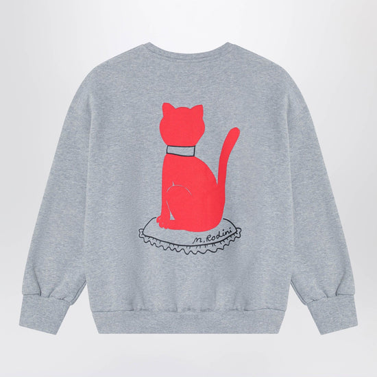 Crew-neck sweatshirt from Mini Rodini in grey organic cotton fleece, featuring long sleeves, front and back cat print and ribbed trim.