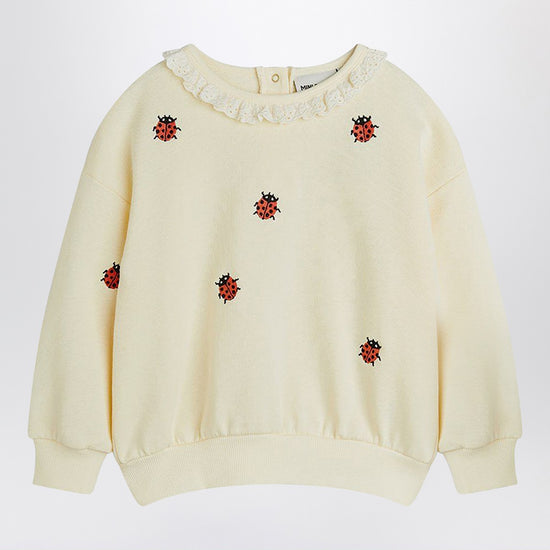 Mini Rodini sweatshirt in organic ivory cotton, featuring long sleeves, embroidered ladybugs all over, a round neck with lace detail, buttons on the back, and ribbed edges.