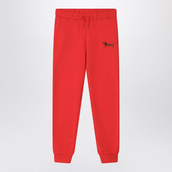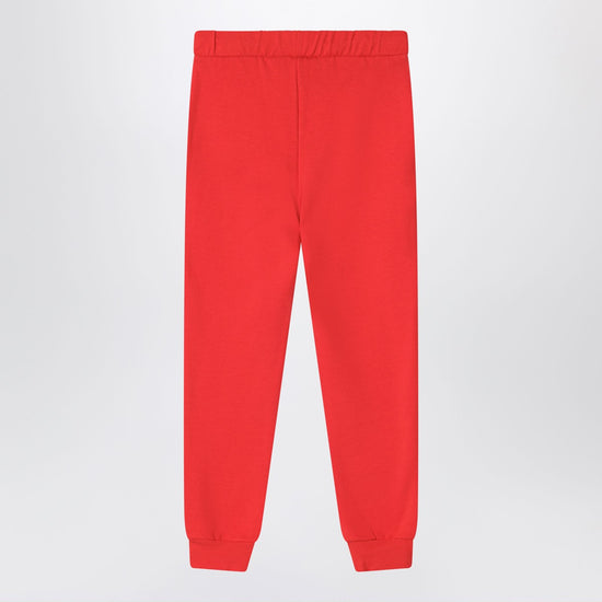 Red organic cotton jogging trousers from Mini Rodini featuring an elasticated waistband with drawstring, two side welt pockets, ribbed trims and a logo patch with a small dog on the front.