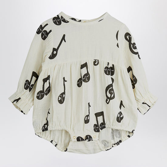 White cotton crew neck body by Mini Rodini with contrasting musical notes all over, featuring long sleeves with elasticated cuffs, snap buttons on the back and on the crotch, and an elasticated hem.