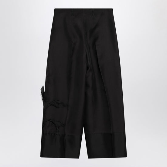 MKDT Studio pants in black silk and wool, featuring belt loops, front closure, two side welt pockets, and tone-on-tone raised floral embroidery. Size and Fit - Model wears size 36 FR Model measurements: Height: 178 cm Chest: 89 cm Waist: 62 cm Hips: 88 cm