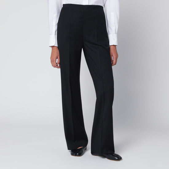 MKDT Studio trousers in black wool, featuring straight leg with front pleat, side zip closure, and one back welt pocket. Size and Fit - Model wears size 36 FR Model measurements: Height: 178 cm Chest: 83 cm Waist: 63 cm Hips: 91 cm