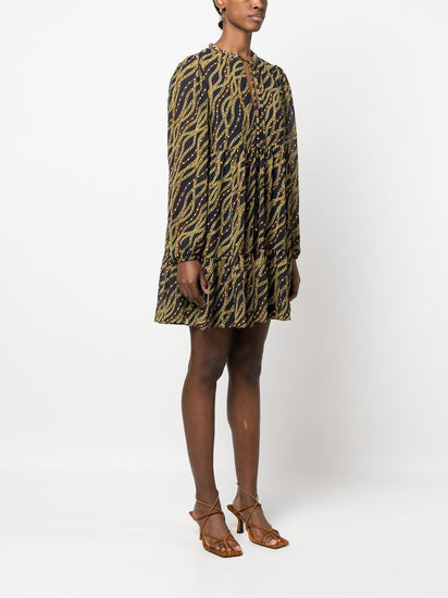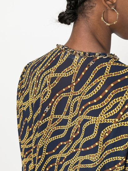 chain-link print dress from MICHAEL MICHAEL KORS featuring midnight blue, recycled polyester blend, chain-link print, frilled neckline, V-neck, self-tie fastening, elasticated cuffs, long sleeves, flared skirt and above-knee length. Conscious: This item is made from at least 50% recycled or upcycled materials. For recycled synthetic clothing products we highly recommend using a microfibre-catching washing bag to ensure that no microplastics that can pollute water are released in the process.. Printed midi dress Size and Fit - This piece fits true to size. We recommend you get your regular size. Model is 1,75m / 5ft 8in wearing size S