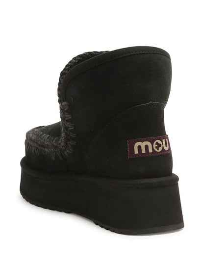 black suede whipstitch trim appliqué logo ankle-length round toe flatform sole Mini Eskimo Platform boots