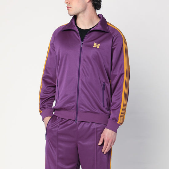 Purple Needles sweatshirt, characterized by a high collar, long sleeves with an ochre striped band, front closure with double zip, two zip pockets on the front, contrasting embroidered logo on the chest, and ribbed edges. Size and Fit - Model wears size L Model measurements: Height: 185 cm Chest: 105 cm Waist: 85 cm Hips: 100 cm