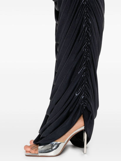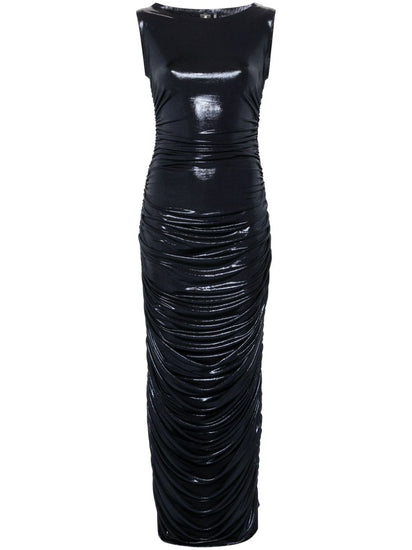 navy blue stretch-design glossy finish slash neck sleeveless ankle-length ankle-length Shirred long dress Size and Fit - This piece fits true to size. We recommend you get your regular size. Model is 1,75m / 5ft 8in wearing size S