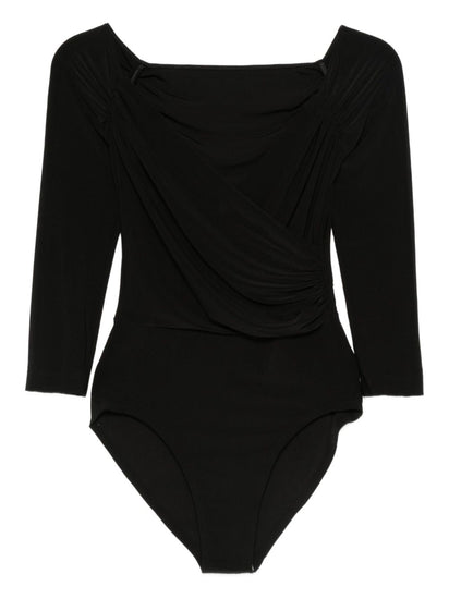 black draped detailing square neck three-quarter sleeves gathered detailing Just a reminder that this piece must be tried on over your own garments. Off shoulder bodysuit