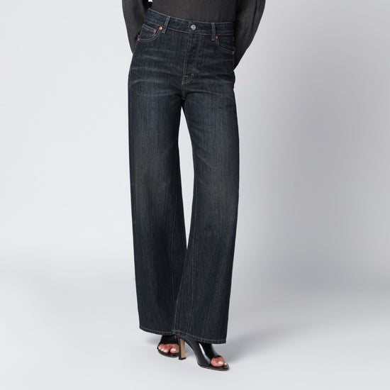 Our Legacy indigo blue vintage-effect cotton denim jeans, featuring front zip and button closure, waistband with belt loops, five classic pockets, back logo patch, visible stitching, and wide relaxed fit. Size and Fit - Model wears size 26 Model measurements: Height: 178 cm Chest: 89 cm Waist: 62 cm Hips: 88 cm