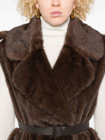 brown faux fur double-breasted fastening belted waist flap pockets wide-notched collar Faux fur long vest