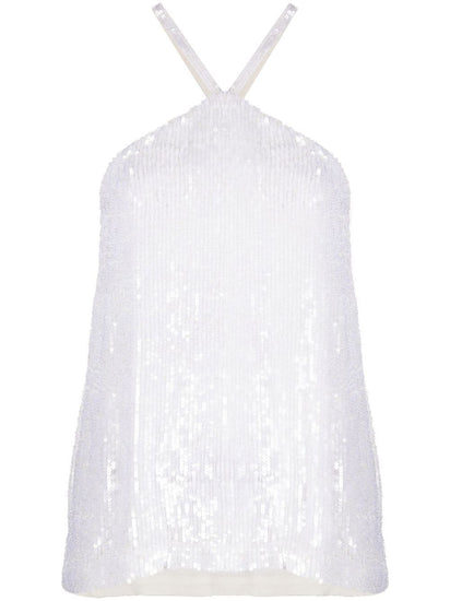 sequin halterneck top from P.A.R.O.S.H. featuring white, sequin design, halterneck, rear criss-cross straps, sleeveless, side slits and curved hem. Sequinned TOP Size and Fit - This piece fits true to size. We recommend you get your regular size. Model is 1,75m / 5ft 8in wearing size S