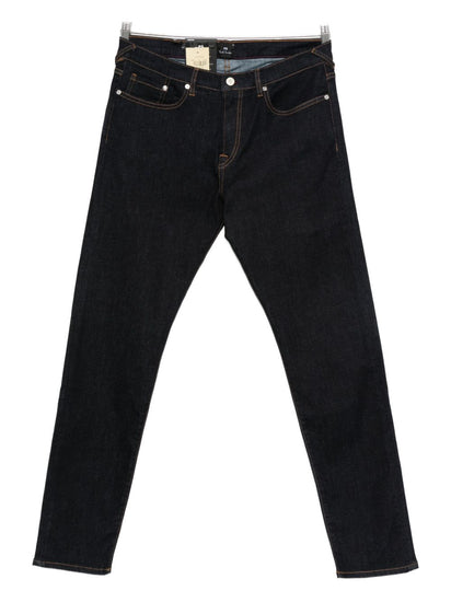 dark blue contrast stitching five pockets button fly belt loops Denim cotton jeans