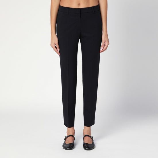 Black wool blend slim trousers from Quelledue featuring a front zip and hook fastening, waist loops, two side welt pockets and two back welt pockets with button fastening. Size and Fit - Model wears size 40 IT Model measurements: Height: 179 cm Chest: 82 cm Waist: 65 cm Hips: 90 cm