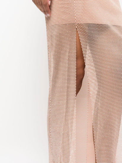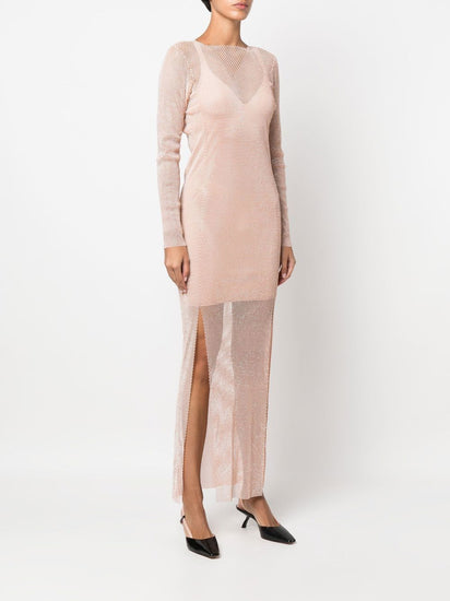 rhinestone-embellished sheer maxi-dress from SANTA BRANDS featuring blush pink, cotton blend, rhinestone embellishment, semi-sheer construction, round neck, long sleeves, side slit and mid-length. Rhinestones embellished long dress Size and Fit - This piece fits true to size. We recommend you get your regular size. Model is 1,75m / 5ft 8in wearing size UNI