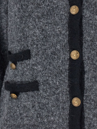 grey textured knit black trim gold-tone buttons flap pockets button fastening Dulcinea wool blend jacket