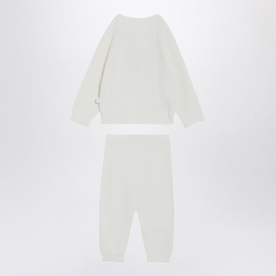 Off-white Teddy & Minou two-piece set in cotton blend yarn, consisting of a crew-neck long-sleeve sweater with wooden buttons on the shoulders and shorts with elasticated waist and ribbed edges.