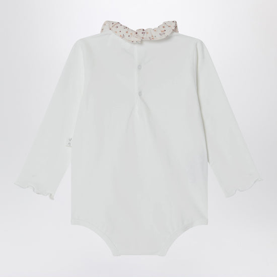 Teddy & Minou bodysuit in milk-white cotton blend, featuring long sleeves with scalloped cuffs, cream ruffled collar with pink floral print, back button closure, and snap buttons at crotch.
