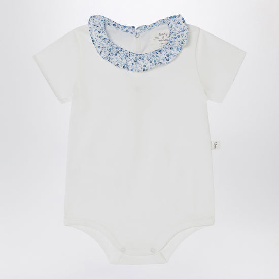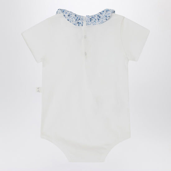 Teddy & Minou''s white cotton onesie, characterized by short sleeves, snap buttons on the crotch, a light blue ruffled collar with Liberty style print, and a closure at the back with buttons.