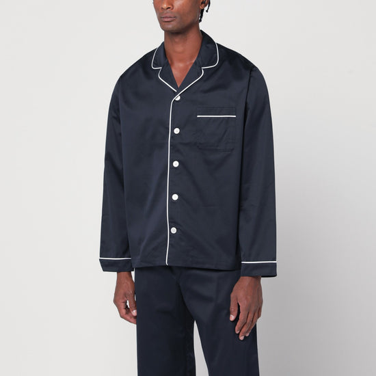Blue organic cotton pyjama shirt by Tekla, featuring long sleeves, front button closure, white contrast trims, logo tag on the side, and a chest patch pocket. Size and Fit - Model wears size L Model measurements: Height: 187 cm Chest: 102 cm Waist: 76 cm Hips: 92 cm
