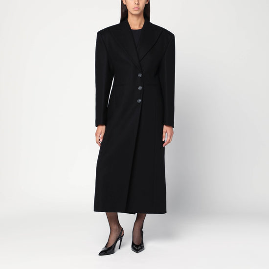 The Andaman coat in black wool blend, characterized by wide padded shoulders, classic lapels, front buttoning, front welt pockets, buttoned cuffs, and a central vent at the back.
