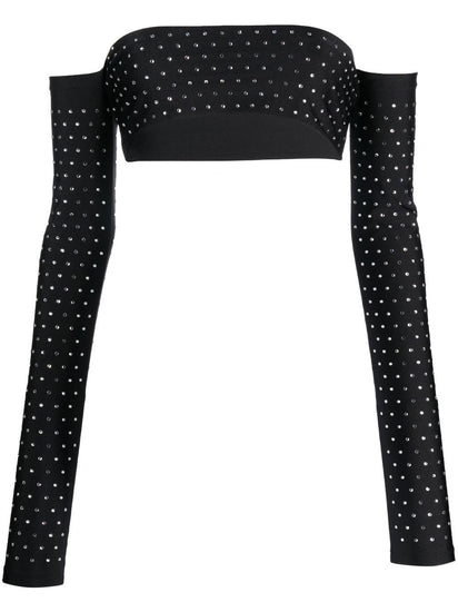 studded off-shoulder top from THE ANDAMANE featuring black, stud embellishment, off-shoulder, long sleeves and cropped. Lexi Crystal crop top Size and Fit - This piece fits true to size. We recommend you get your regular size. Model is 1,75m / 5ft 8in wearing size S