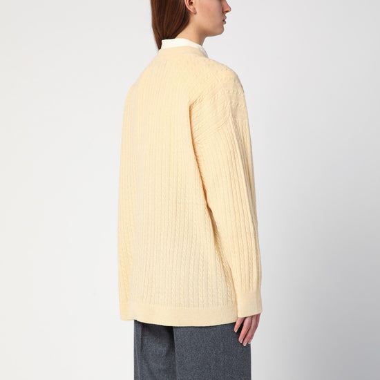 Light yellow wool and cashmere jumper from The Garment featuring a wide V-neck, long sleeves, a cable-knit design, ribbed edges and an oversized fit. Size and Fit - Model wears size 8 UK Model measurements: Height: 178 cm Chest: 77 cm Waist: 60 cm Hips: 87 cm