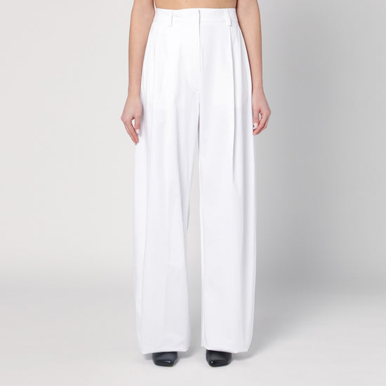 Wide trousers by The Latest in white cotton, featuring a front zip closure with hook, high waist with belt loops, two side welt pockets, two back flap pockets, and pleats at the front. Size and Fit - Model wears size 40 IT Model measurements: Height: 179 cm Chest: 82 cm Waist: 65 cm Hips: 90 cm