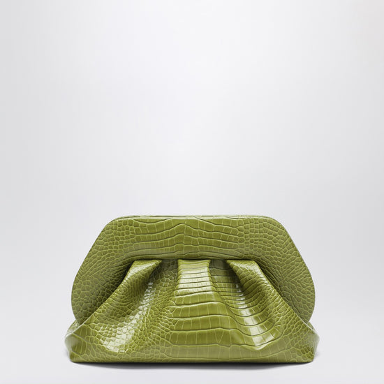 Clutch by THEMOIRÈ in eco-leather kiwi color with crocodile print, characterized by double magnetic closure, decorative ruching, removable shoulder strap, fabric lining, and gold-colored metal hardware. Size and Fit - Width 30 cm x Height 16 cm x Depth 11 cm Shoulder strap lenght: 105 cm