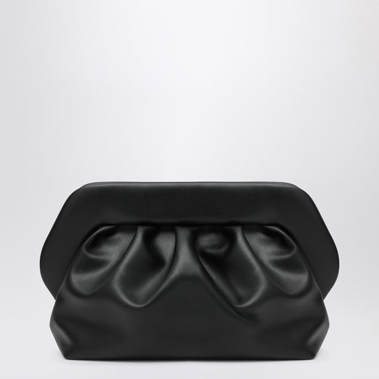 Clutch by THEMOIRÈ made of black vegan leather, featuring a double magnetic closure, decorative ruffles, a removable shoulder strap, fabric lining and gold-coloured metal hardware. Size and Fit - Width 32 cm x Height 18 cm x Depth 15 cm Shoulder strap lenght: 105 cm