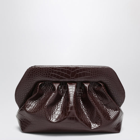 Clutch by THEMOIRÈ made of ebony vegan leather with crocodile print, featuring a double magnetic closure, decorative ruffles, a removable shoulder strap, fabric lining and gold-coloured metal hardware. Size and Fit - Width 32 cm x Height 18 cm x Depth 15 cm Shoulder strap lenght: 105 cm