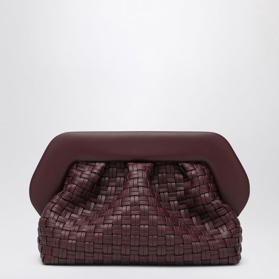THEMOIRÈ clutch bag in plum-coloured vegan leather, featuring a woven pattern, double magnetic closure, decorative ruffles, removable shoulder strap, fabric lining and gold-coloured metal hardware. Size and Fit - Width 32 cm x Height 18 cm x Depth 15 cm Shoulder strap lenght: 105 cm