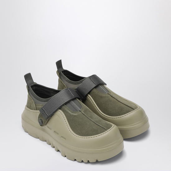 UGG shoe with an upper made of olive green suede and neoprene, characterized by an adjustable strap on the mask, microfiber lining, molded PU insole, sugarcane EVA midsole, sugarcane EVA outsole, polyester edge, and shaped rivet with UGG® logo.