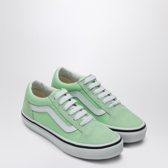 Green suede and canvas sneaker from Vans featuring a reinforced round toe, a lace-up closure, a padded collar, a white side stripe and a waffle rubber sole.