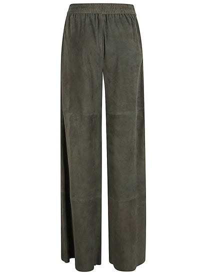 Dark green colour, made of leather, high elasticated waist, wide leg, decisive stitching, two side welt pockets. Suede leather trousers
